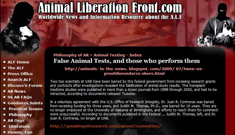 The ALF web person has been up to some fairly deceitful tricks. Look closely at the screen shot below from the ALF website (Warning: AR Website). The article is about two scientists who have apparently been barred from their university. The interesting thing to note is the link to the Speaking of Research committee webpage at the bottom of the article.