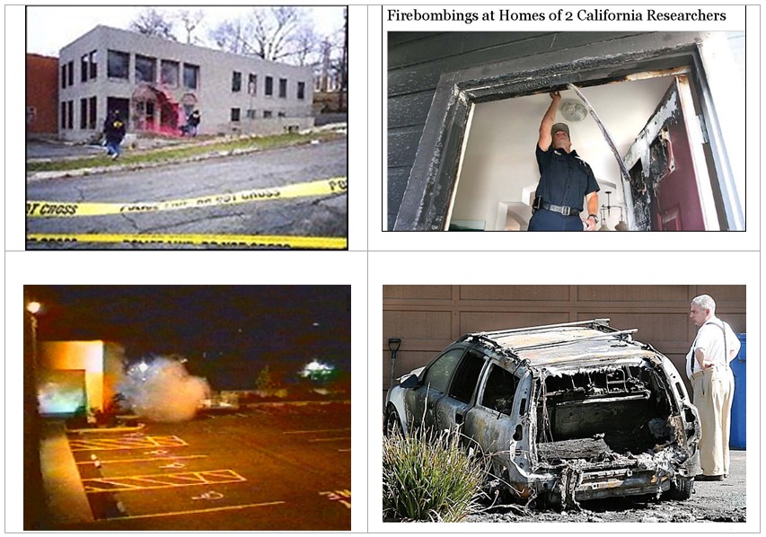 The next two photos on the right column show a car and home that were firebombed at the University of California Santa Cruz. The researchers were targeted for their use of animals. The family was in the home when the firebomb was tossed at the house. Family members (including two small children) escaped through an upstairs window. It’s easy to see how that case could have been even more tragic. The person or persons responsible for these crimes have never been caught.