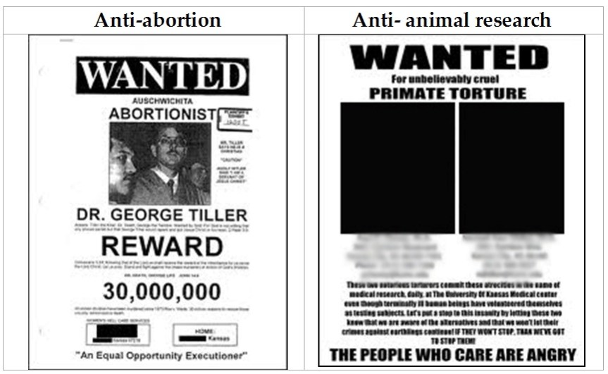 The poster is eerily similar to one recently issued by animal rights extremists targeting two researchers at a research university that also happens to be in Kansas. In this case, we covered the photos because thankfully, the researchers have not been targeted with physical violence. However their names are being been heavily circulated by extremist groups.