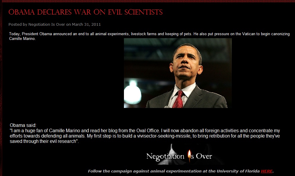 We recently blogged about the disturbing threats made by the Negotiation is Over animal rights extremists website.