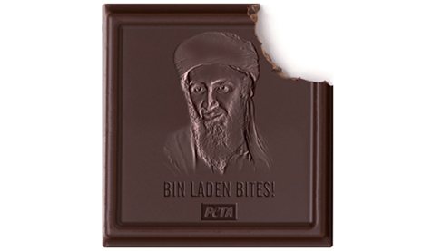 If you’re a little hungry after being up all night watching the news and chanting “USA! USA!” we’ve got the perfect snack for you: PETA’s “Bin Laden Bites” chocolates.