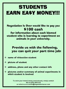 On the University of Florida campus, the animal rights movement has been rekindled. On a weekend in early July, Lisa Grossman and Camille Marino, self-proclaimed animal extremists and members of the group Negotiation Is Over (NIO), were seen handing out fliers offering $100 for the personal information of students who conduct research on animals (see picture below). With this information, NIO seeks to influence students away from animal research by informing them of the consequences of said research: harassment, threats, physical assault, and property damage. Ms. Marino is quick to point out that she is not advocating violence, but is simply warning that it could occur. However, this is merely a smokescreen for Marino to hide behind. She, and others like her throughout the animal rights movement, have embraced violence as a means for discourse in the past for a very simple reason: they feel that animal researchers are immoral, because animals have rights.