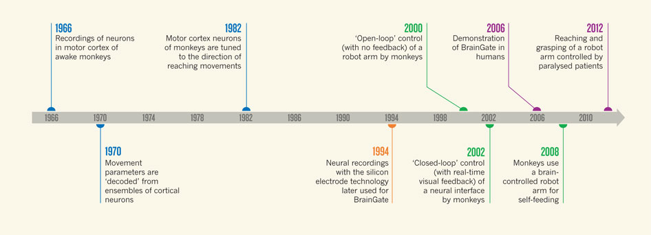 As explained in a nice News and Views piece by Andrew Jackson that accompanies the article, this type of work builds on decades of previous research on the neural mechanisms that control arm movements (here, here and here) (blue on the Fig above), on the development of chronic multi-electrode arrays (orange), their recording properties in animals, and on feasibility studies of neural interfaces in monkeys (here, here, here and here) (green), which opened the way to clinical studies in humans (here and here) (purple).
