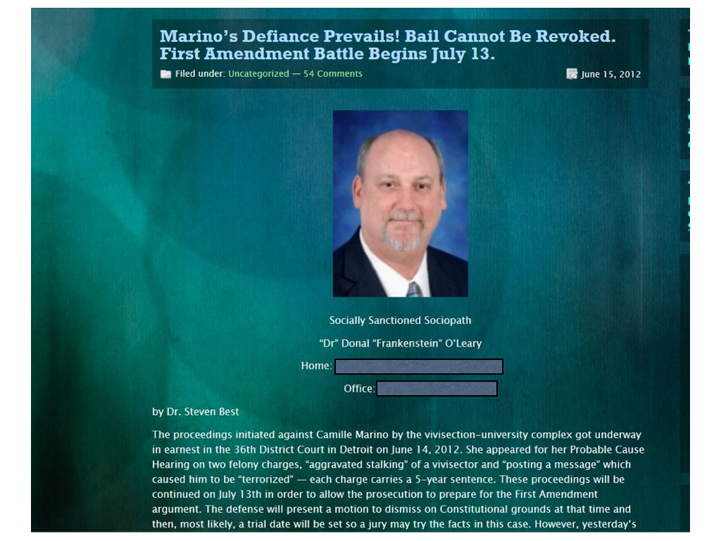 In April 2010, he [Prof. Best] posted on NIO a video of himself attempting to confront a man rumored to trap and poison cats that wandered into his yard. The man wasn’t home, but his wife and small daughter were. “If I hear he’s hurting cats, I’m going to be all over his office,” Best told them. “You tell him I’ll have a thousand people all over this place. You tell him Steve Best dropped by. You remember that name.”