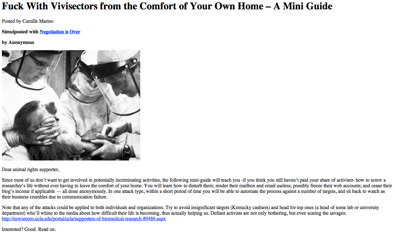 Addendum III: Marino publication of a how-to guide to anonymously harass investigators electronically during Prof. Steven Best tenure as Senior Editor of Total Liberation.