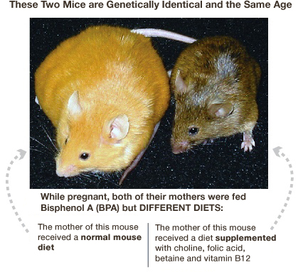 This means that one gene can express itself in two different ways depending on its environment. The reason was the diet changed the epigenetics of the offspring. The researchers then found that they could treat the mother mouse with a different diet and “cure” the offspring from the unhealthy agouti gene phenotype.