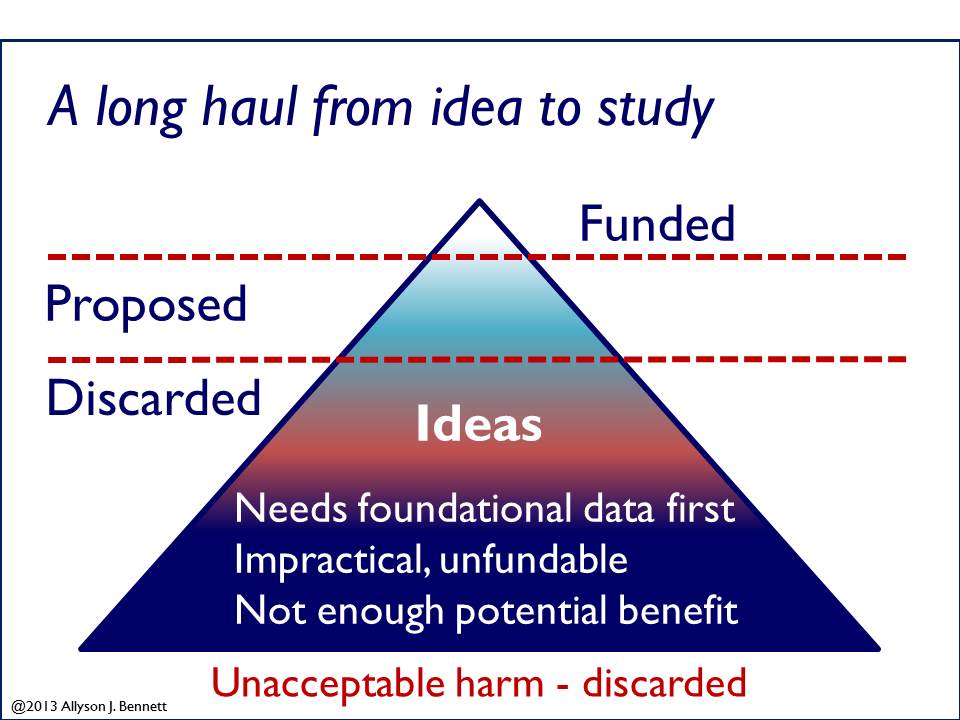 In general, the process looks like this: Scientists generate ideas that are based in careful study of what is known, what is not known, what methods already exist, what facts we have. They next critically evaluate and review relevant previous literature and data– often soliciting others’ expert knowledge– to determine whether the idea is novel (has not already been tested), of potential importance or significance, and feasible.