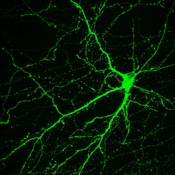 This neuron, created in the Su-Chun Zhang lab at the University of Wisconsin–Madison, makes dopamine, a neurotransmitter involved in normal movement. The cell originated in an induced pluripotent stem cell, which derive from adult tissues. Similar neurons survived and integrated normally after transplant into monkey brains—as a proof of principle that personalized medicine may one day treat Parkinson’s disease.