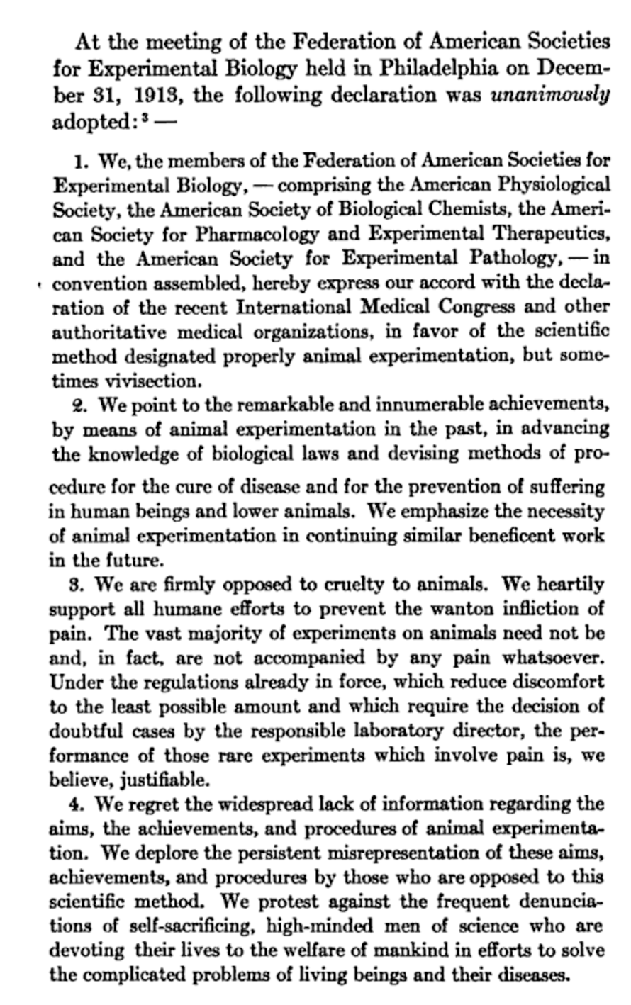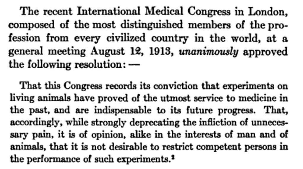 Scientists were not alone in their outrage. One hundred years ago medical professionals from all over the world were prompted to issue a statement at the International Medical Congress supporting animal research:
