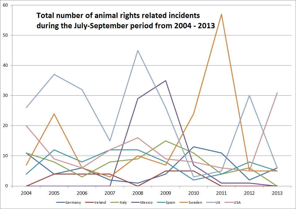 Sweden saw a massive drop from 57 incidents in 2011 to just 5 in the 3 month periods in both 2012 and 2013. Spain has seen a slight rise in incidents, whereas Mexico, Germany and Ireland continue to see a decline in activism.