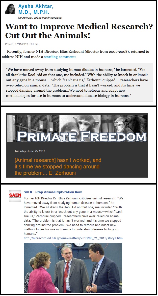 We would like to thank NABR for taking the time to write to Zerhouni. Hopefully, this clarifies his position, and the quote he’ll be remembered for will not be about “kool-aid”, but that he “can say unequivocally that animal research remains indispensable element in improving both human and animal health”.