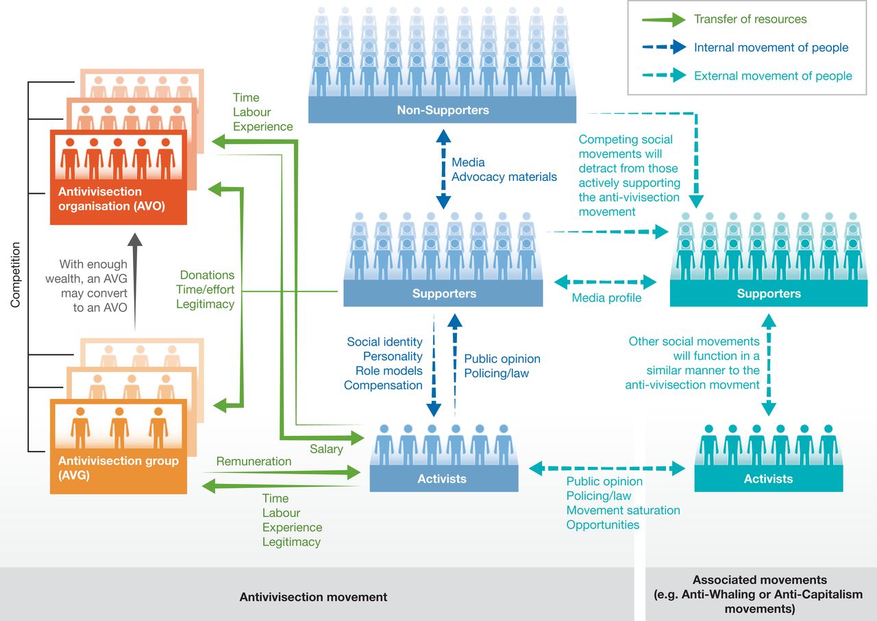 The blue dashed arrows indicate the movement of people within the antivivisection movement: a person might read the website of an AVG and decide to change from non‐supporter (either someone who disagrees with the AV views or has not formed an opinion either way) to a supporter, donating money or spending their time and effort signing petitions. The green arrows denote the movement of resources (e.g. time and money), though it should be noted that these are not exhaustive lists of resources. In return for their time and effort, that person might get a “feel‐good buzz” about helping animals, or from the acceptance of their peers. Later, they might decide to get more involved. This change is the movement from supporter to activist (though the divisions are not clear‐cut). The activist still feels good about what he or she is doing—possibly with a greater social acceptance from their newfound colleagues—and might also find himself or herself remunerated. Note that by giving time or money to any one AVG/AVO, they are choosing not to give those resources to another, so there is a natural competition between these AVGs/AVOs. Years later, the person might find they have less time and will drop back to supporter status, or might find that the massive publicity surrounding an associated movement draws their time and effort (turquoise dashed arrows), such that they stop their involvement with the original AV movement. Such associated movements need not have any relation to animal rights, but the more similar they are to the AV movement, the more competition there will be. Legitimacy is an important resource that both supporters and activists provide. An animal rights group that can only muster 20 supporters at important demonstrations will eventually find its supporters moving to competing AVG/AVOs. When the entire antivivisection movement comes under negative media spotlight, or as laws or police activities make certain activities more difficult, many supporters may move to other associated movements, and many activists may choose to put their expertise into other areas.