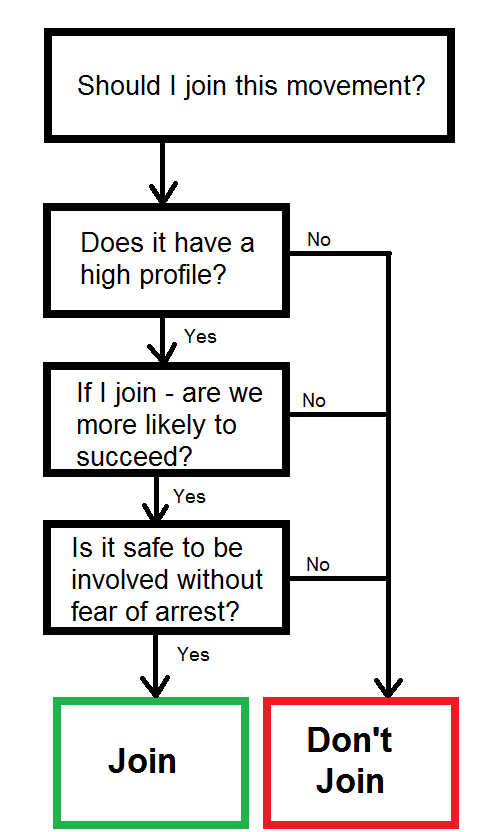 For our young impressionable potential-activist, deciding which cause to throw his time and effort behind, he or she may consider the following questions to themselves about each one. While it may be argued that the AV movement had a high profile in the early-mid 2000s, it was for the wrong reason, with people likely to bring up images of graverobbing and arson attacks. The increasing resilience of the animal research community was also making victories harder to come by (reducing the chance of success), and the police spotlight was also making it less attractive to new potential recruits. Instead our young activist may consider their time better spent challenging rising inequality (e.g. Occupy movements) or fighting against government badger culls (indeed many former antivivisection activists have recently moved to this issue). Diagrammatically (see first image) this can be seen as the teal arrows from supporters and activists to the supporting movements.