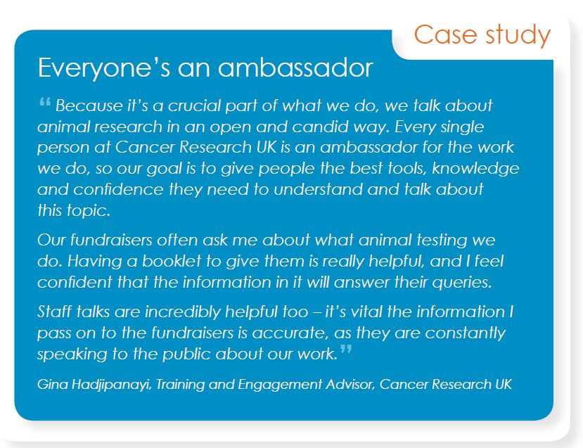 - Being Prepared – what charities should do in advance to help them provide the public with the information they need. This includes writing a position statement on animal research, having case studies ready and establishing a process and protocol for responding to enquiries.