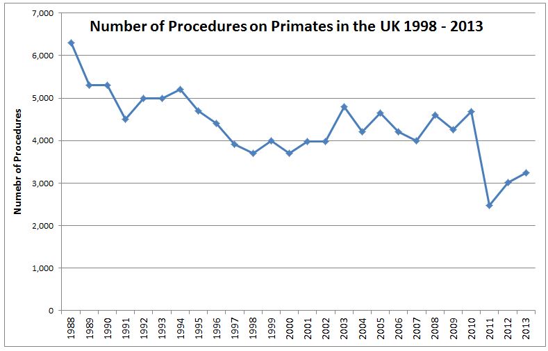 The number of non-human primates rose 11% from the previous year, however a sharp decline in 2011 means primate use remains lower than for any year prior to 2011. Note that the graph above uses procedures, not numbers of primates (as they were easier to collate). In 2013 the number of primates used was 2,202, up slightly from 2,186 the year before.