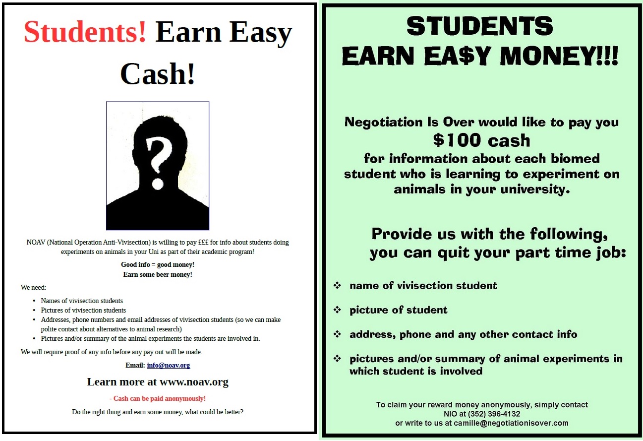The poster (below, left) produced by NOAV shares much likeness of a similar campaign poster (below, right) created by American animal rights extremist group, Negotiation is Over, led by Camille Marino. If you look carefully below you will notice the use of language, and structure of the poster is remarkably similar. Both offer students “easy cash/money” for the names, pictures, addresses, contact details, and experiment details of students involved.