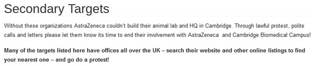 National Operation Anti-Vivisection’s second campaign targets a new animal research facility being built by the British-Swedish pharmaceutical company, AstraZeneca, in Cambridge. What makes this campaign concerning is a section of the website called “Secondary Targets”.