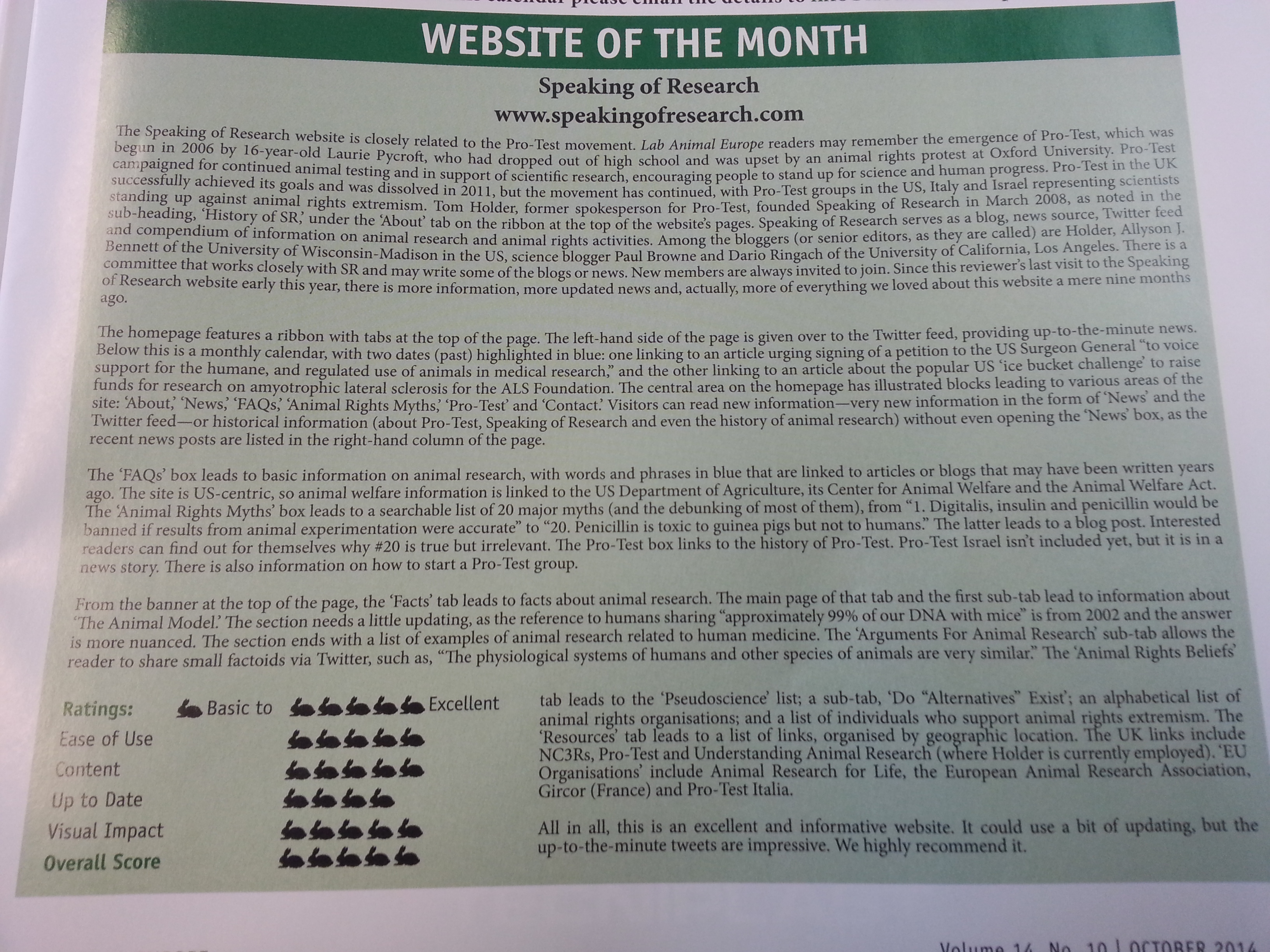 A few months after the Speaking of Research website got full marks in a recent review we’ve done it again. In Lab Animal Europe‘s Website of the Month, Speaking of Research got an overall score of five out of five and was considered ‘Excellent’ for Ease of Use, Content and Visual Impact.