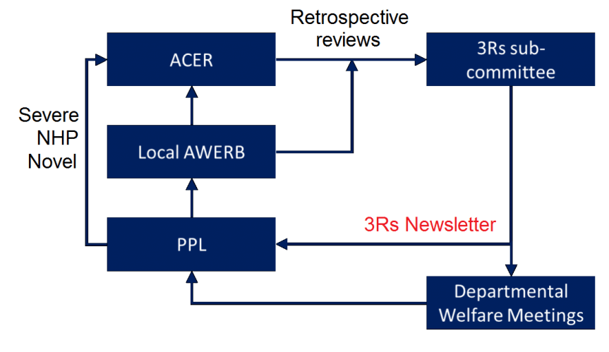 In addition to the ethical review process, the University also has a 3Rs sub-committee reporting directly to ACER, which receives copies of all retrospective reviews to identify key developments in the 3Rs across the University. These developments are combined to form a termly 3Rs newsletter, which also contains information on relevant workshops, lectures and courses, such as NC3Rs notifications.