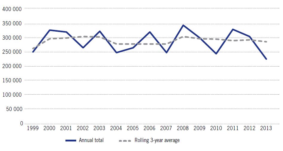 While the total number of animals fell by 26% from 2012, it should be noted that the numbers of animals used each appears to fluctuate wildly between around 200,00 and 350,000, as we can see below. The main falls in 2013 were in cattle and mice, whereas there were large rises in birds and sheep.