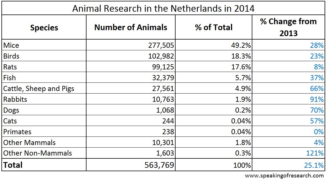 The Netherlands Food and Consumer Product Safety Authority (Nederlandse Voedsel- en Warenautoriteit, NVWA) have produced statistics showing the number of procedures carried out on animals in 2014.