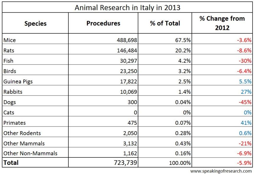While we will be posting Austria’s 2015 statistics on Monday, Italian authorities seem a little bit behind the times having only recently published their 2013 statistics for the use of animals in research. Italy carried out 723,739 procedures on animals in 2013, 5.9% less than in 2012.