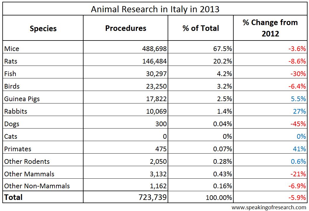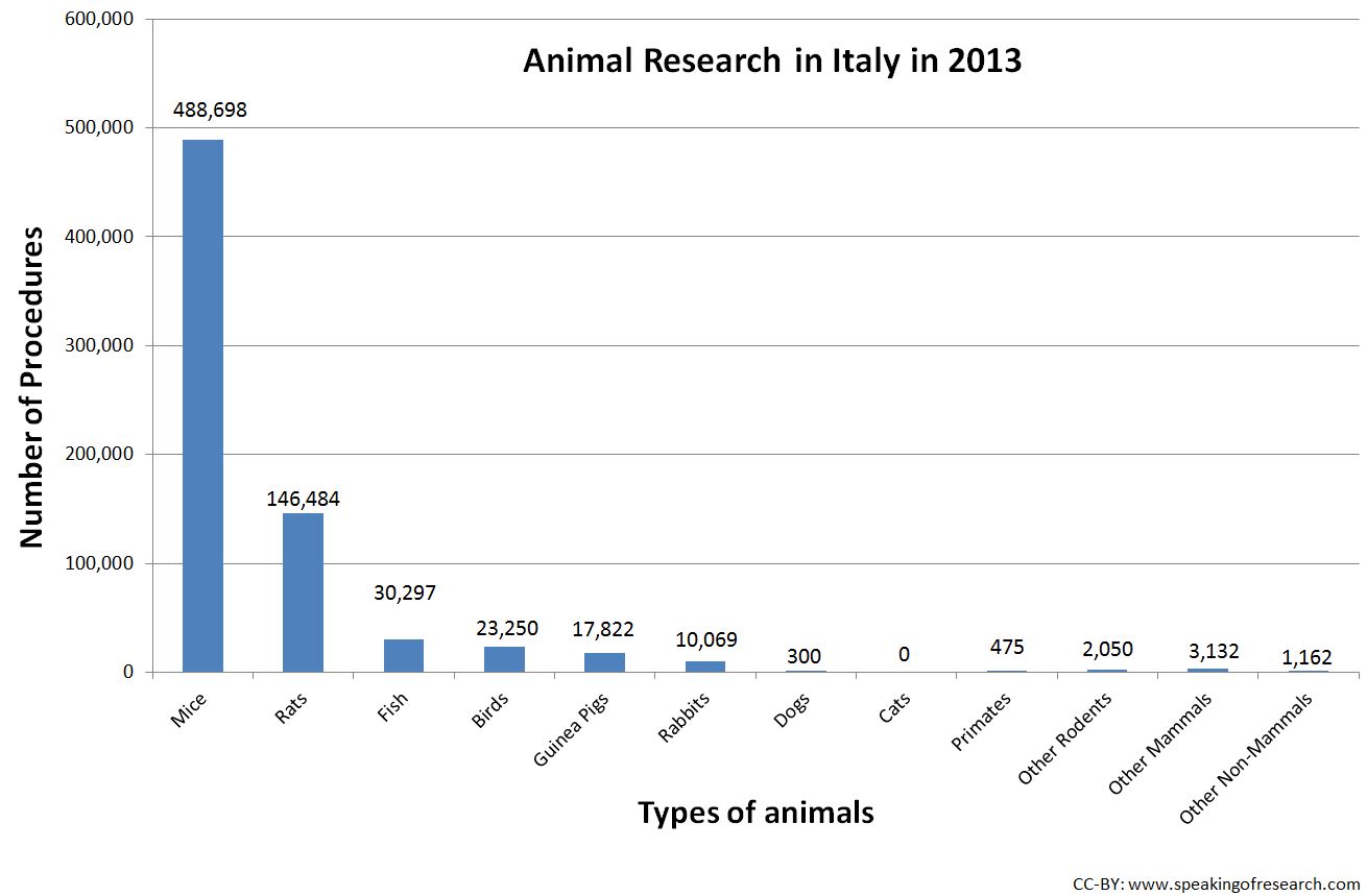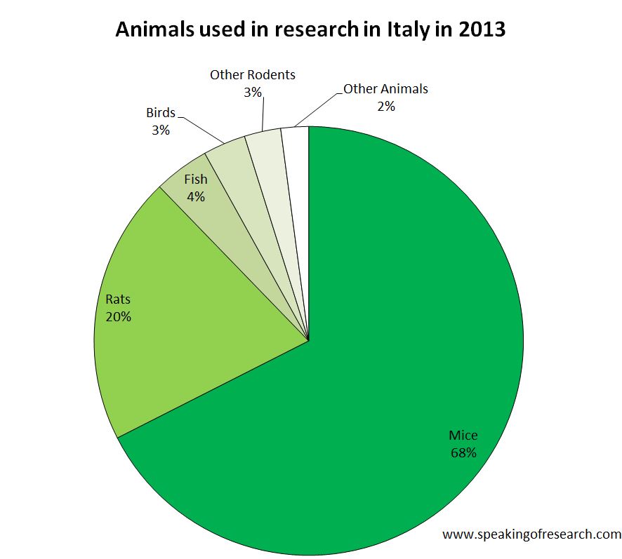 Rodents accounted for over 90% of all animals used in Italy in 2013 (mainly mice at 67.5% of the total). This rises to almost 98% when you include fish and birds. Primates and dogs together accounted for 0.1% of all research animals. No cats were used in 2013 (0r 2012).