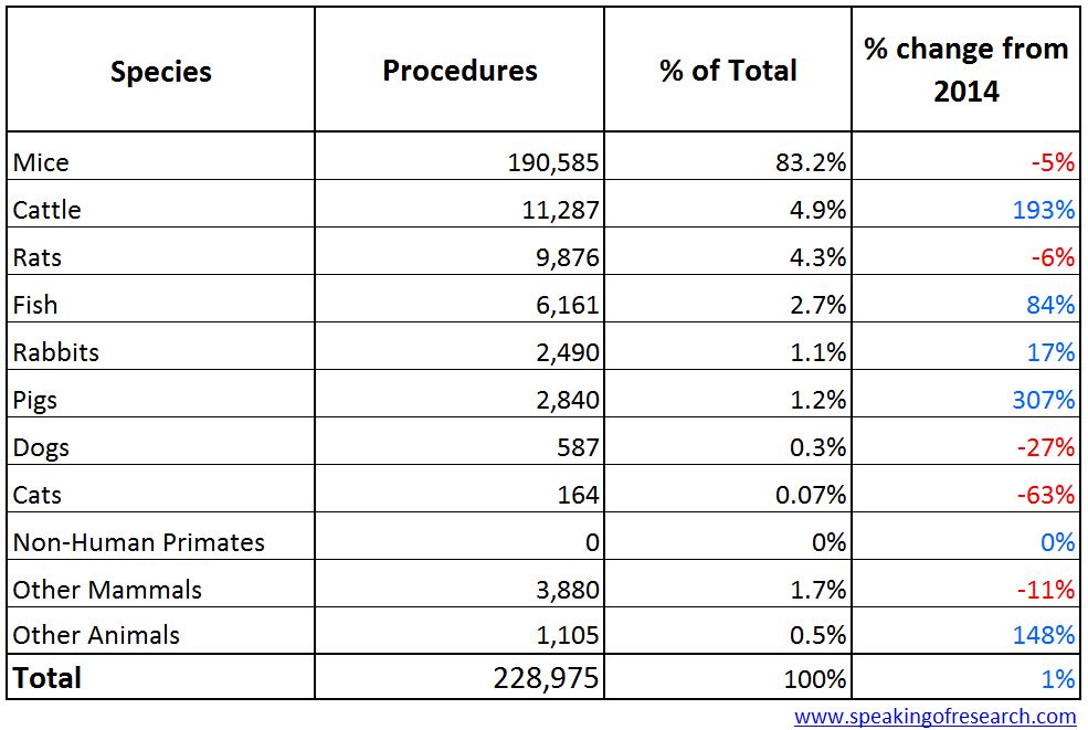 Ireland has recently published its annual statistics showing the number of animals used for research and testing in 2015. Ireland carried out 228,975 procedures on animals in 2015, 1% more than in 2014.