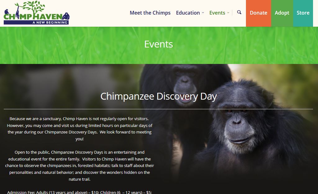 “After Chimpanzee Discovery Days as well as during some school breaks, pre-registered and pre-paid visitors are invited to Chimp Chat & Chew, a program that enables guests to get a more intimate look at the chimpanzees and personal access to Chimp Haven staff. Guests receive a behind-the-scenes tour, an informative presentation by one of our professional staff, a catered lunch, and an up-close-and-personal look at our residents.”