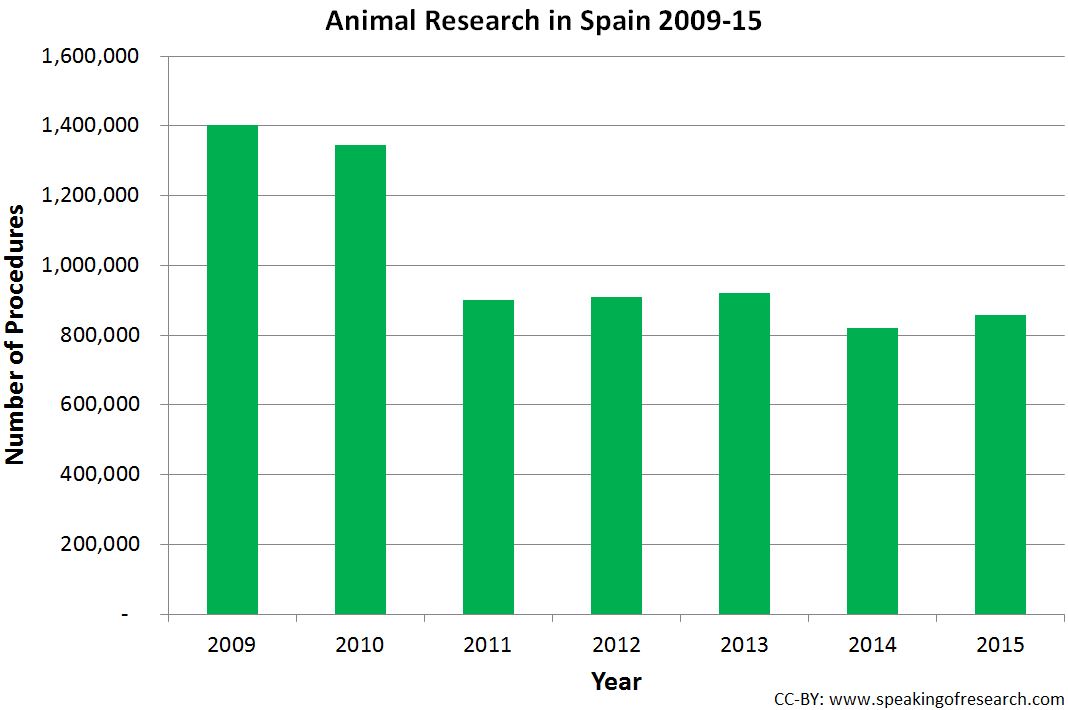 In this post we take a closer look at Spain’s recently published animal research statistics for 2015 (see previous years here). These show that in 2015, there were 858,946 procedures on animals for scientific purposes, up 5% from 2014 (821,570 procedures). The number of animals is likely to be very similar (with only 14,473 procedures on animals which had previously been used in prior research).