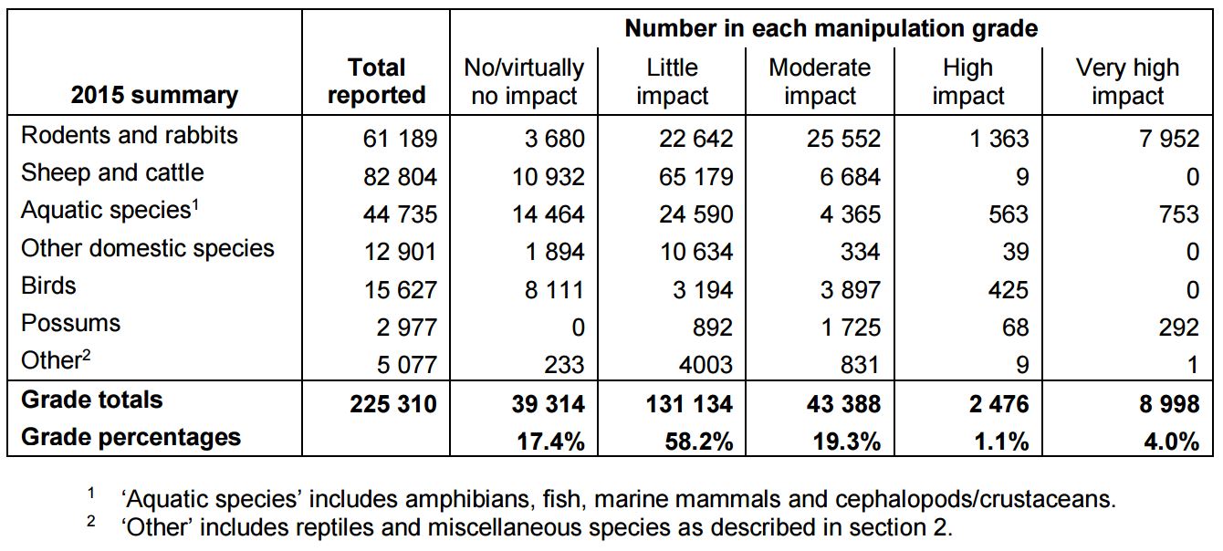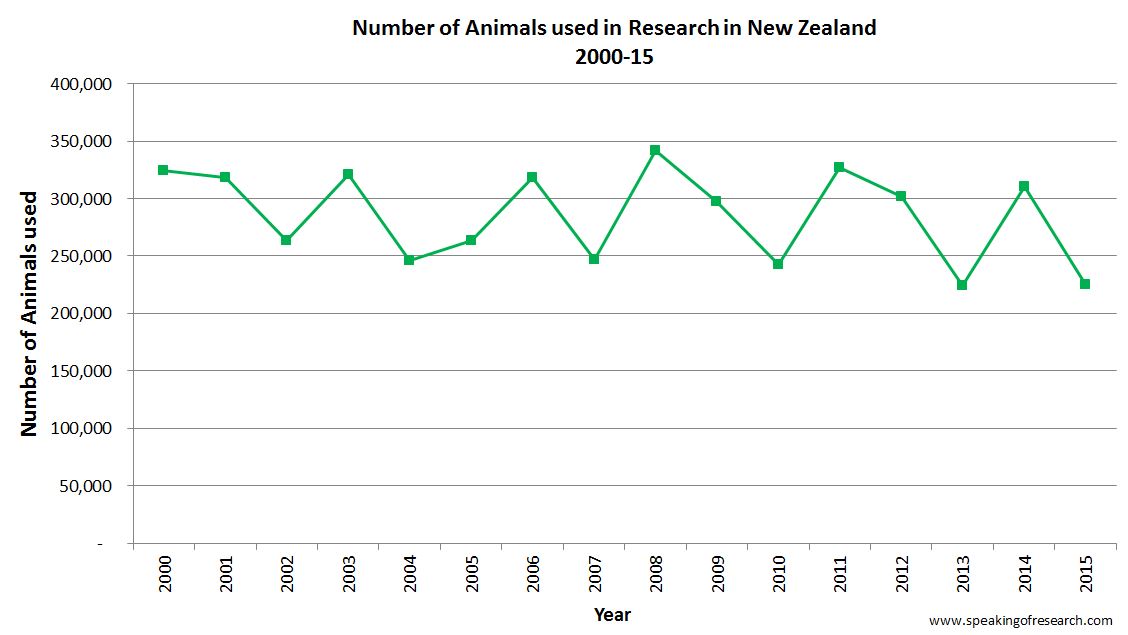 Today, the Ministry for Primary Industries in New Zealand published its 2015 annual report on “Statistics on the Use of Animals in Research, Testing and Teaching”. It shows the number of animals used in research in 2015 was 225,310, down 27% from the previous year.