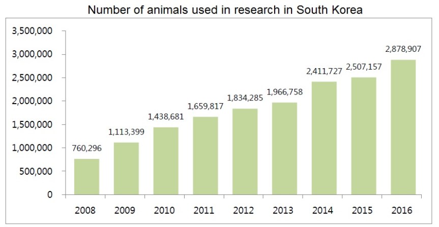 In 2016, South Korea used 2,878,907 animals in research, up 14.8% from the previous year.