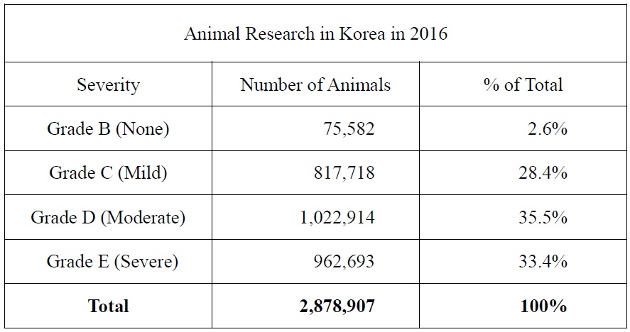 South Korea also produced severity statistics, similar to those in Europe. 2.6% of research showed no harm to the animal, 28.4% was mild, 35.5% was moderate and was 33.4% severe.We are unclear if these categorizations are based on pre-experiment licenses (what the researcher believed the severity would be) or post-experiment evaluation (what the researcher saw the severity to be).