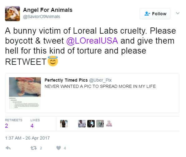 When shocking images such as this one appear, it is very easy to get caught up in the emotion of the moment and want to react and share with your social media circles. However, it is important that we try our best to check sources, look for the origins of a photo, or get a second opinion. This rabbit image has been making its rounds on the internet since 2013, with the claims that the rabbit is a “victim” of animal testing. L’Oreal even responded to the claim, stating that they no longer test their products, or ingredients on animals, and that they do not contract the testing out to other facilities, either. The exception being for parts of the world where such testing is mandated by law (e.g. China). However, they are also actively working with nations where testing is required by law, in order to find suitable alternatives.
