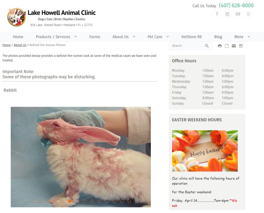 The problem with the shared image is that the origin is just not true. The image is definitely that of a rabbit suffering from hair loss, but the image comes from a Florida veterinary clinic’s website. The image was posted to the clinic website to illustrate some of the cases they have dealt with in rabbits and other less common mammalian pets that the clinic sees.