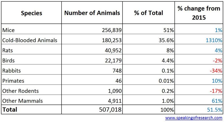 Historical statistics show that until the spike in 2016, the number of animals has been fairly constant, fluctuating between around 275,000 and 340,000. The slight variations may account for individual projects which used a lot of animals, or from slight changes in science funding over the years. It appears that the sharp rise in 2016 is due to one or more research projects specifically working with fish – that account for most of the 170 thousand rise in animal numbers.