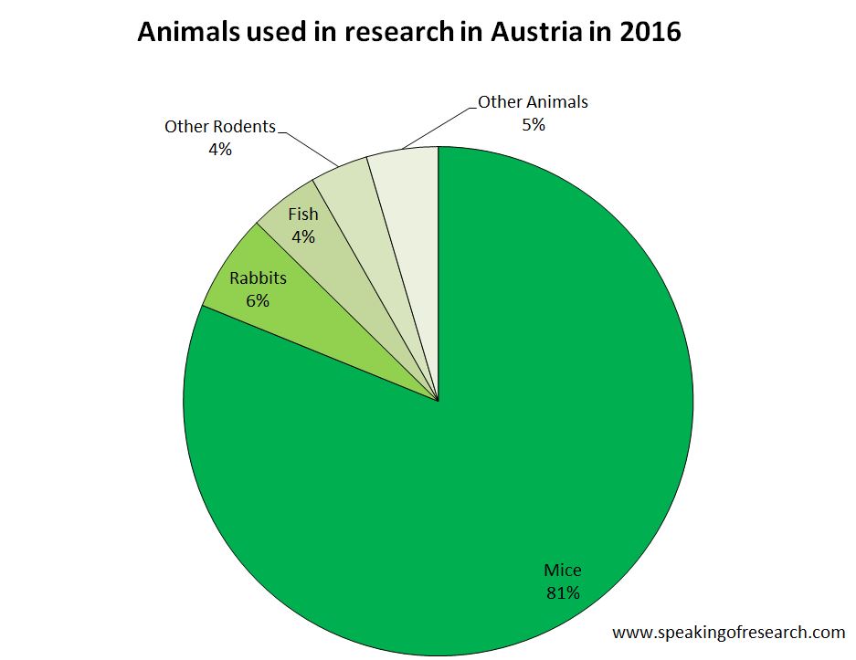 The vast majority of research was conducted on mice (81.2%), with rabbits (6.2%) and fish (4.4%) the next most common species. It is interesting that Austria, rabbits are the second most common species, a fact not seen anywhere else in Europe, though neighbouring Germany also has a relatively high number (4% of total). No primates were used in Austria in 2016 (or the previous two years) and dogs and cats accounted for less than 0.08% of all animals used despite the rises in the number of procedures for the former.