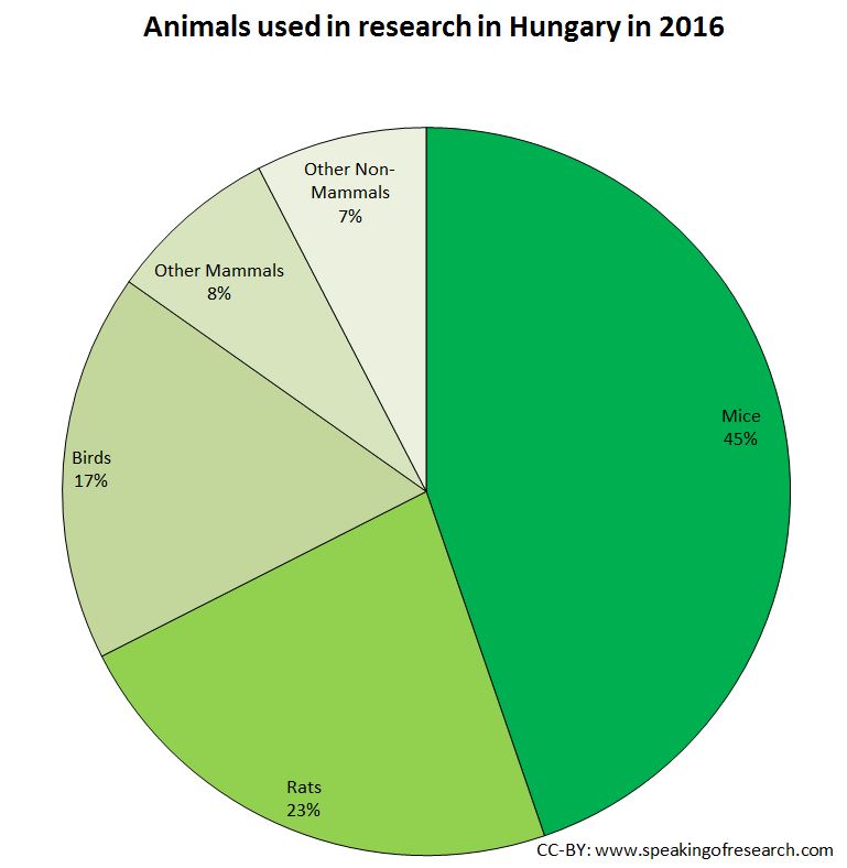 Together, mice, rats and birds account for 84% of all procedures in Hungary, this figure rises to over 95% when fish, reptiles, amphibians and guinea pigs are included. The use of primates went from 3 in 2015, down to 0 in 2016 (presumably after a specific study ended). Dogs and cats accounted for less than 0.4% of all animals used.