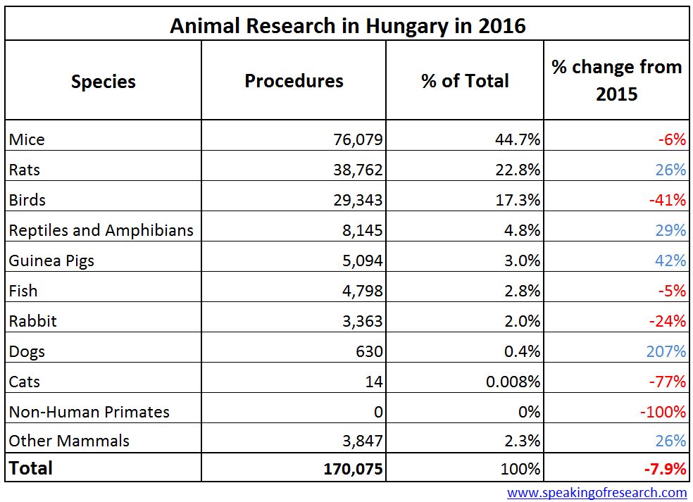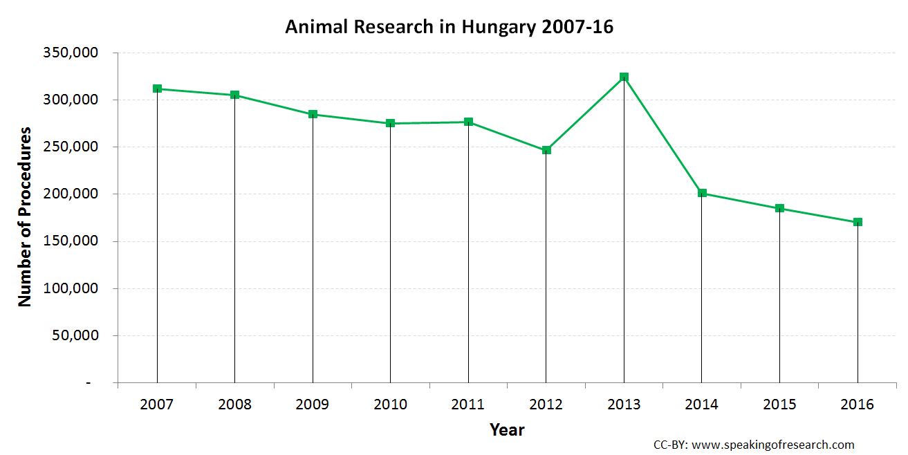 Hungary reported 170,075 procedures on animals in 2016, a 7.9% fall on the previous year.