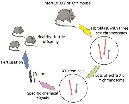 - Can a new technique for the creation of artificial sperm lead to a cure for genetic infertility? Sex is determined by the X and Y chromosomes. Females have two X chromosomes (XX) and males have one X and one Y (XY). About 1 in 500 males are born with an extra Y chromosome, Klinefelter’s syndrome (XXY), while roughly 1 in 1,000 males are born with double Y chromosomes, or Jacob’s syndrome (XYY) — two different forms of trisomy, which lead to infertility. Mimicking these syndromes in mice, in a jointly funded research project by the EU and Japan, these researchers took pieces of ear tissue, cultured them and then used fibroblasts from that culture to create stem cells. Curiously, in some of these stem cells, the extra sex chromosome was lost – yielding “normal” cells. They then induced these “normal” stem cells to differentiate into sperm cells and injected them into the testes of these infertile mice where the matured into healthy sperm cells — although some of these mice developed tumors. These healthy sperm cells were then collected and through assisted reproduction, created healthy fertile offspring. In a preliminary experiment, they also found that stem cells derived from men with Klinefelter’s syndrome also lost their extra sex chromosome. This research was published in the journal Science.