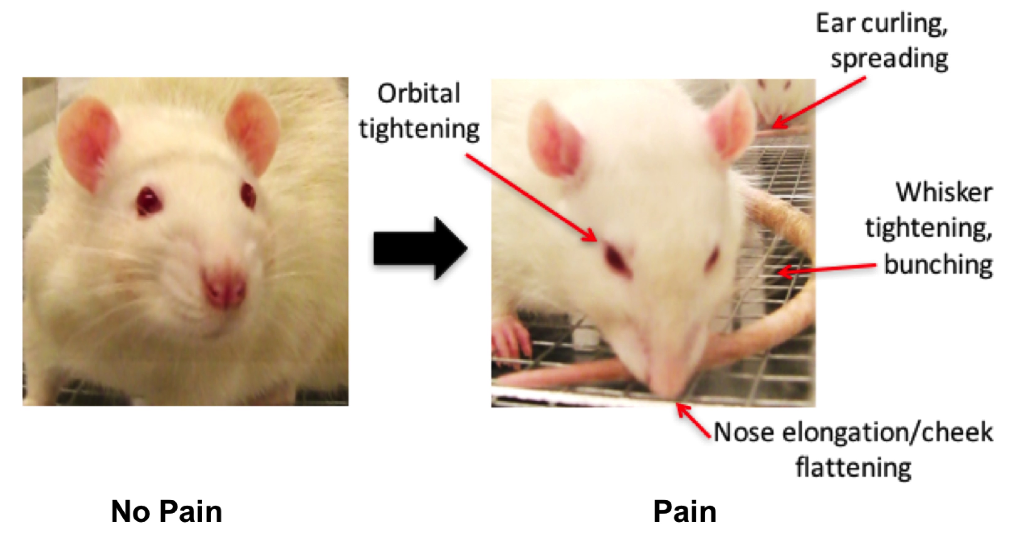 The first behavior I examine is the “pain face,” also known as a grimace. When humans are in pain, we grimace by narrowing our eyes, wrinkling our nose, and raising our upper lip. Animals also grimace by changing certain parts of their faces, including their eyes, ears, cheeks, and nose or snout. An assessment called the grimace scale was first developed in mice by Dr. Jeffrey Mogil at McGill University in Canada. The grimace scale has since been translated to rats, rabbits, cats, pigs, sheep, and horses. Researchers have found that mice with lesions to their insular cortex don’t grimace. Because the insular cortex is involved in the emotional component of pain in humans, this may indicate that grimacing reflects the emotional effect of pain.