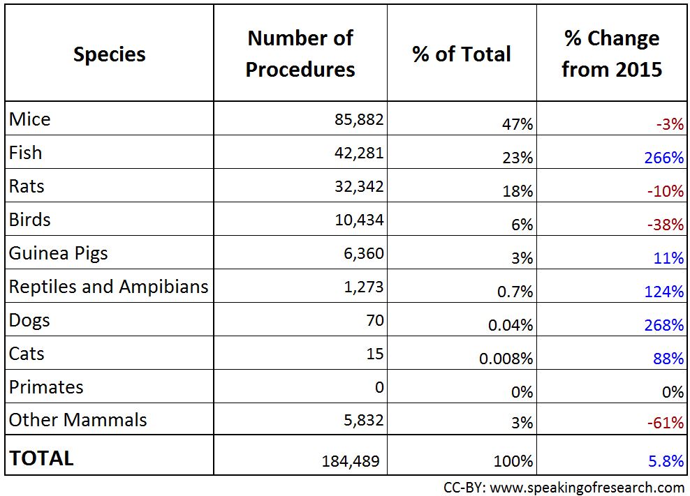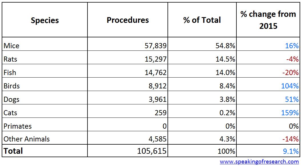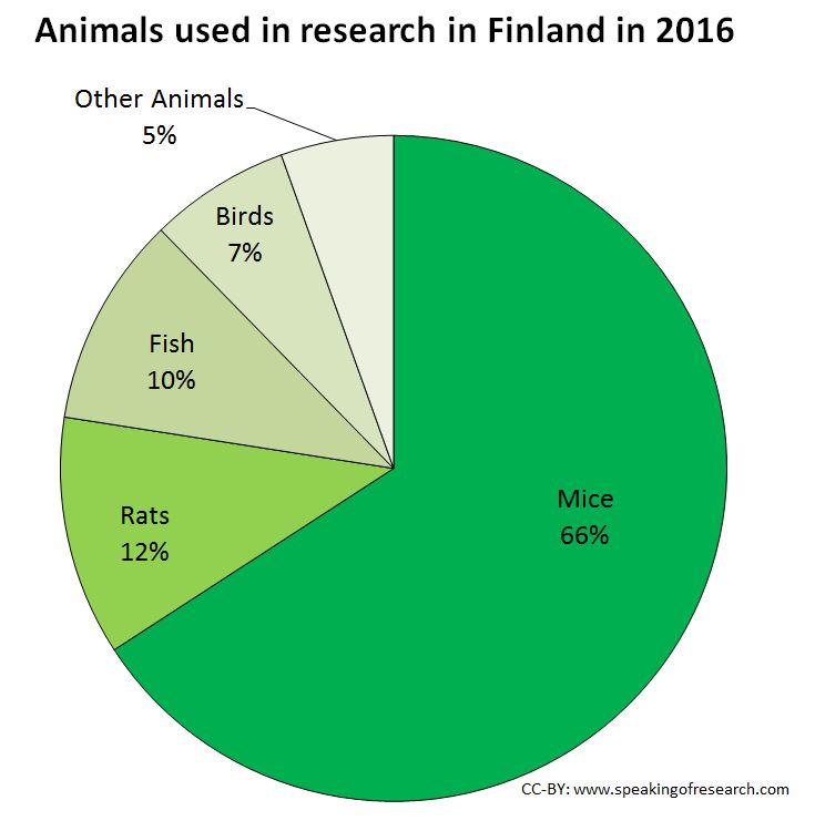 Most research was conducted on mice (66%), rats (12%) fish (10%) or birds (7%), together accounting for 95% of all research procedures. No primates were used.