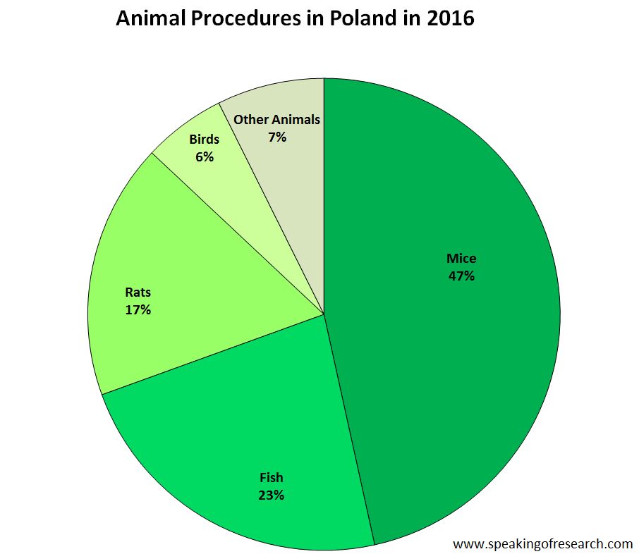 93% of all research in Poland is on mice, rats, birds and fish – similar to most other EU countries. Prcoedures on dogs and cats together add up to less than 0.05% of research (85 procedures), and there were no procedures on primates.