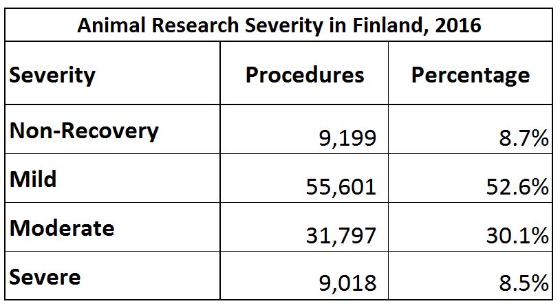 Finland, like all EU countries, reports the severity of every procedure after they have been completed. Mild and non-recovery accounted for 61.3% of procedures (60.3% in 2015), moderate was 30.1% (down from 33.9% in 2015) and severe was 8.5% (up from 5.8% in 2015). All but one severe procedure was on mice and rats (the last was on pigs).