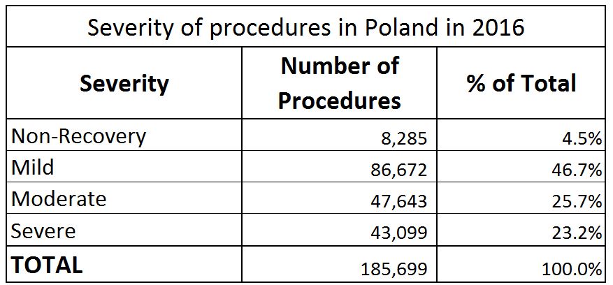 Poland reports the severity of every procedure after they have been completed. Mild and non-recovery accounted for 51%% of procedures, moderate was 26% and severe was 23%. The proportion of severe experiments is higher than in most other EU countries. This may be a result of slightly different guidelines currently in Poland for classifying severity.