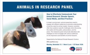 In November, SR editors Amanda Dettmer and Paula Clifford were panelists in a Society for Neuroscience session titled “Animals in Research Panel: How to Effectively Communicate Your Animal Research: Elevator Speech, Social Media, and Best Practices.” A panel at the American College of Neuropsychopharmacology meeting “Advocating for Animal-Based Neuropsychopharmacology Research” included SR’s Dettmer, Clifford, and J. David Jentsch.