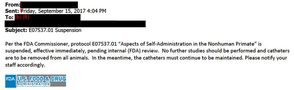 The released documents also reveal that the decision about the research was likely made almost immediately after the letter from Jane Goodall and well prior to the conclusions of the internal review. The documents about the catheter removals likely provide confirmation of that decision. That is because one logical explanation for why the surgery was ordered is that it would be very unlikely that the same animals would continue in research following removal of the catheters. This is simply because the study was specifically interested in comparing “the initiation and long-term maintenance of nicotine self-administration in adolescent and adult subjects.” When the catheters were ordered to be removed, it effectively meant that a new set of monkeys would have to be used to resume the research and answer the original scientific question. At the very least, it would have meant the animals underwent an unnecessary surgery procedure.