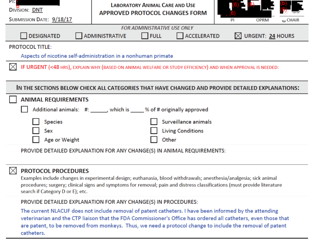 Rather than providing more clarity, the released documents raise further concerns and questions. In particular, they raise questions about why the Commissioner’s office ordered the surgery and how they balanced consideration of risk and animal welfare. The scientists, animal care staff, veterinarians, IACUC, and administration at the NCTR were clearly operating under orders by Gottlieb’s office and did not themselves initiate the catheter removal, as is shown in the IACUC amendment (image above). One must question, however, why the IACUC approved it and allowed the procedure to go forward given that the IACUC should have the authority to act in the interest of animal welfare. Whether IACUC deliberations included discussion of the potential risk is unknown and does not appear to be included in the public records.