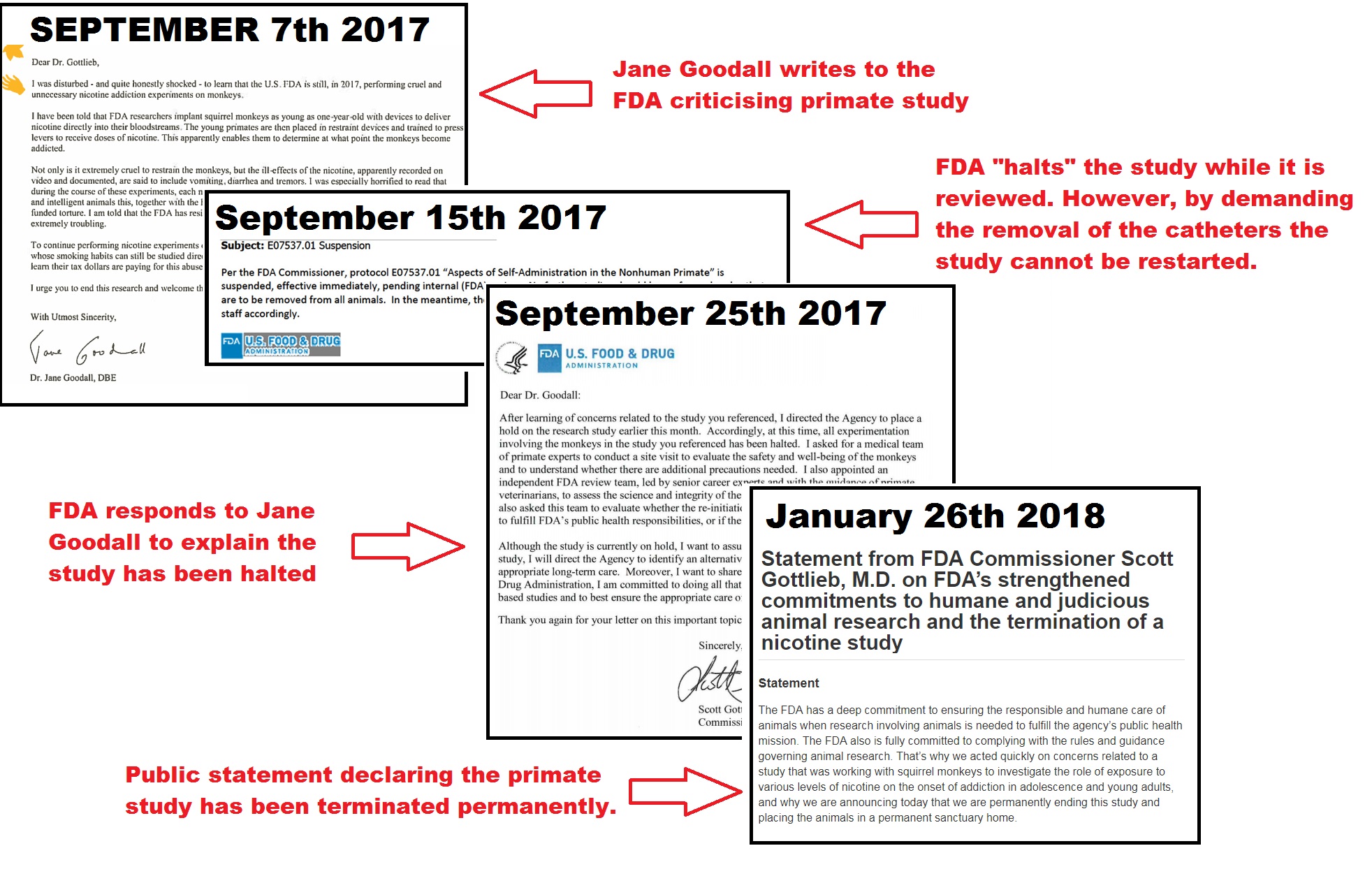 In addition to the FDA’s recent press release about their termination of the study, documents about the animals in the study were also made publicly available by the agency. Whether these documents are similar to the ones released via the FOIA to the White Coat Waste Project, is currently unknown. What we do know, through a source familiar with the research at the NCTR, is that the records and account of events provided by the FDA leave out important information, including correspondence and records that show that the scientific team leading the study halted the work in July – months before the FDA Commissioner’s problematic public “halt” of the study following an equally problematic letter from Jane Goodall. Why has only specific information been made public?