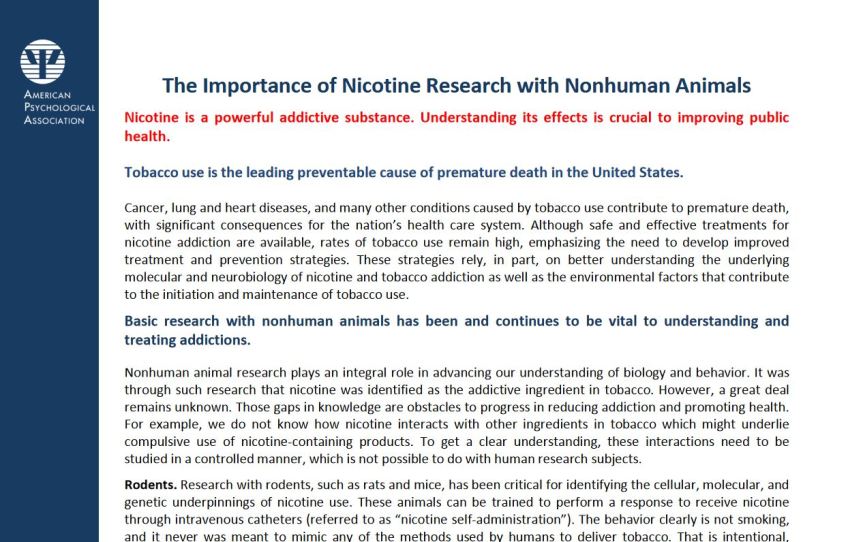 APA also released a factsheet about nicotine and tobacco research—one that provides accurate information about why animal studies are conducted and why it is important to inform public health.